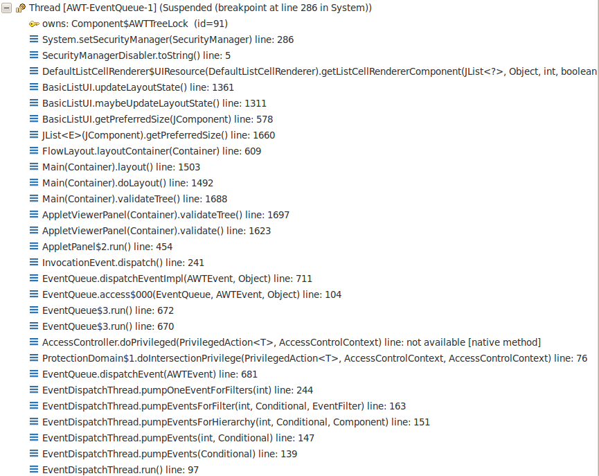 The trick Koivu used to “start” the trusted execution chain was to create a javax.swing.JList instance, passing an object to it and then adding the instance to the applet. What happens then is that an AWT thread (that is trusted) would render that JList instance and would eventually call the toString() method on the object we put inside the JList.