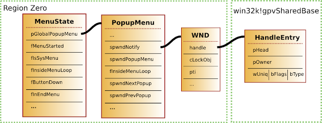 As you can probably remember from the PopupMenu structure shown before, it contains several WND objects, and one of the first actions performed when HMUnlockObject(pWnd) is called is to decrement the lockCount. So we simply set-up two fake WND objects in such a way that the lockCount field will be pointing to the HandleEntry->bType field. When each of those fake WND objects is destroyed it will actually perform a “dec” operation over the bType of our menu object, thus decrementing it from 0x2 to 0x0. We now have a bFlag of 0x1 and a bType of 0x0.